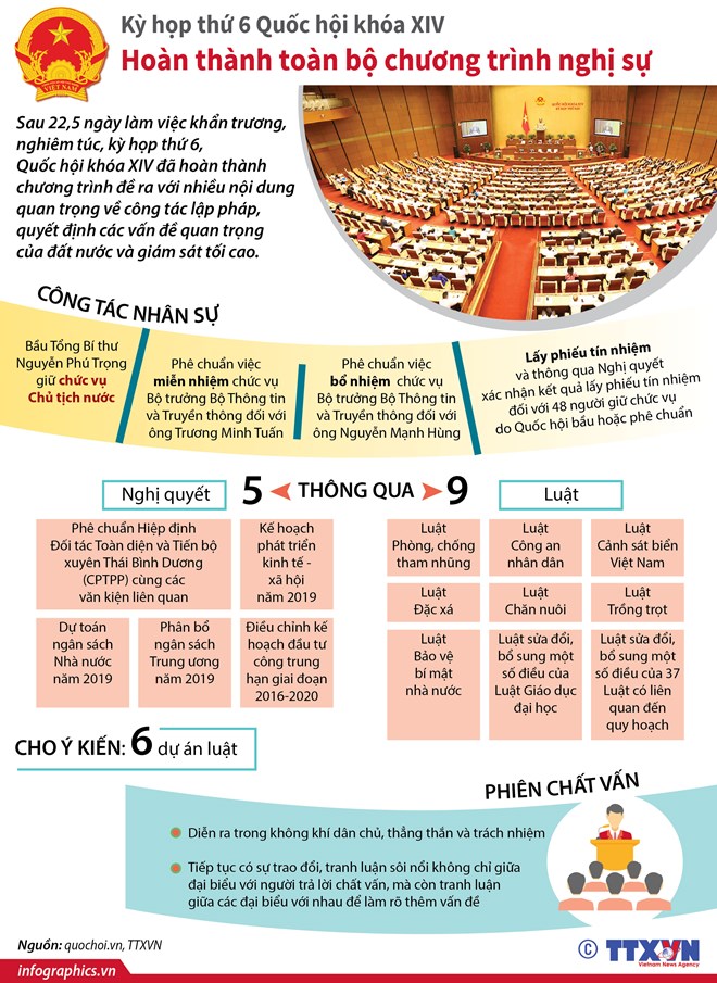 Sau 22,5 ngày làm việc khẩn trương, nghiêm túc, Kỳ họp thứ 6, Quốc hội khóa XIV đã hoàn thành chương trình đề ra với nhiều nội dung quan trọng về công tác lập pháp, quyết định các vấn đề quan trọng của đất nước và giám sát tối cao.