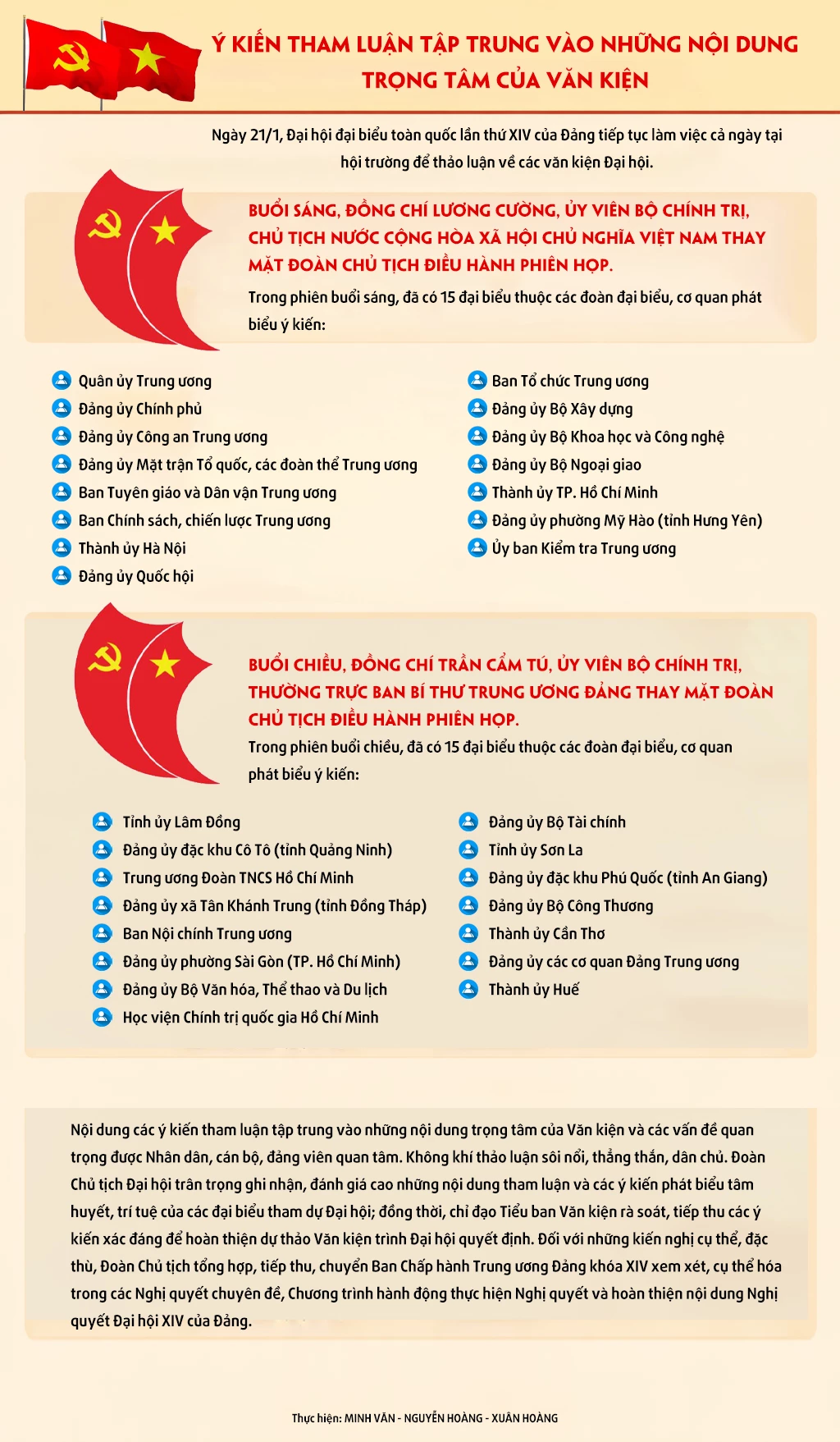 QTO - Ngày 21/1, Đại hội đại biểu toàn quốc lần thứ XIV của Đảng tiếp tục làm việc cả ngày tại hội trường để thảo luận về các văn kiện Đại hội.