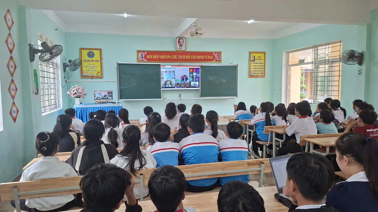 | Học sinh các trường THCS tham gia lễ phát động Cuộc thi trực tuyến "Em yêu biển, đảo quê hương" - Ảnh: Mai Linh |