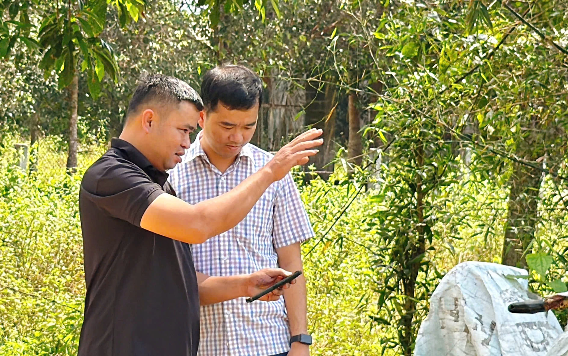 | Anh Nguyễn Văn Trí (bên trái) giới thiệu cách quản lý, giám sát lộ trình di chuyển của đàn bò thông qua ứng dụng trên điện thoại thông minh - Ảnh: L.A |