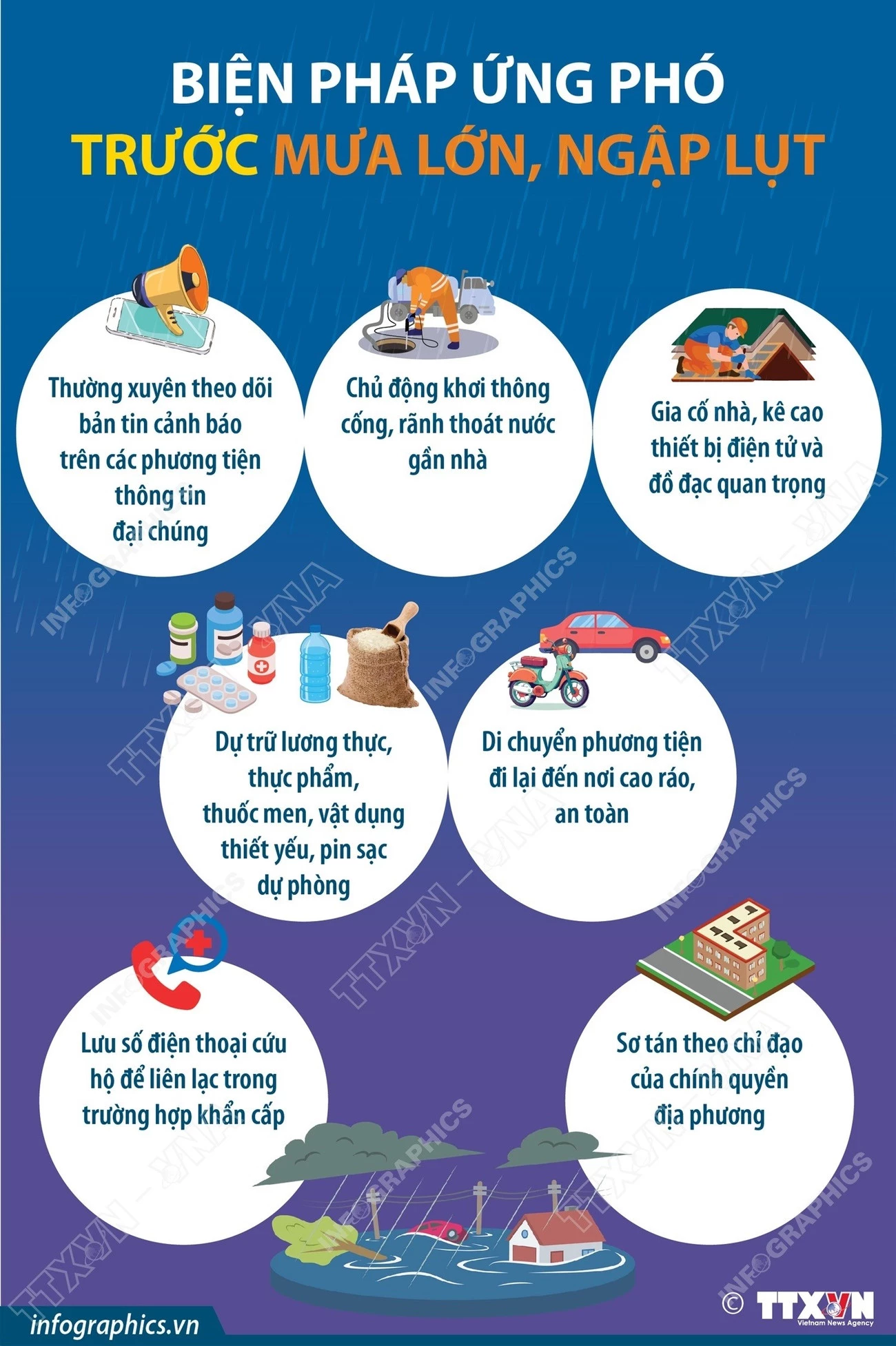 Trước khi xảy ra mưa lớn, ngập lụt, người dân cần thường xuyên theo dõi bản tin cảnh báo trên các phương tiện thông tin đại chúng; chủ động khơi thông cống, rãnh thoát nước gần nhà; gia cố nhà, kê cao thiết bị điện tử và đồ đạc quan trọng; dự trữ lương thực, thực phẩm, thuốc men, vật dụng thiết yếu, pin sạc dự phòng.