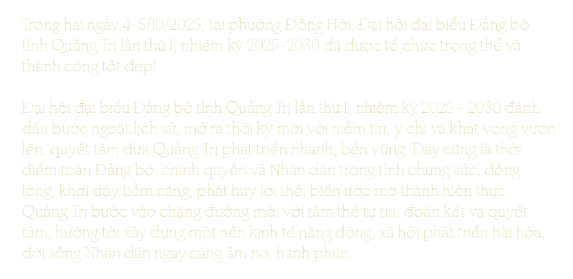 Thành công của Đại hội đại biểu Đảng bộ tỉnh Quảng Trị lần thứ I, nhiệm kỳ 2025-2030 tạo nên sức mạnh cổ vũ to lớn toàn Đảng bộ, quân và dân trong tỉnh vượt lên mọi khó khăn, thách thức, tranh thủ cơ hội mới, phấn đấu trở thành cực tăng trưởng mới trong khu vực miền Trung. Ngay sau Đại hội, tất cả các tổ chức đảng cần tổ chức tốt việc nghiên cứu, quán triệt sâu sắc Nghị quyết, tuyên truyền sâu rộng trong các tầng lớp Nhân dân về kết quả Đại hội; khẩn trương xây dựng, triển khai chương trình, kế hoạch hành động, đưa Nghị quyết Đại hội vào cuộc sống, khơi dậy phong trào thi đua yêu nước sâu rộng của toàn Đảng bộ và Nhân dân.