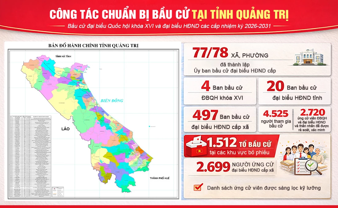 Theo báo cáo của Ủy ban bầu cử tỉnh, hiện Quảng Trị có 77/78 xã, phường đã ban hành quyết định thành lập Ủy ban bầu cử đại biểu HĐND cấp xã bảo đảm theo quy định (riêng đặc khu Cồn Cỏ không thành lập Ủy ban bầu cử vì không tổ chức bầu cử đại biểu HĐND đặc khu).