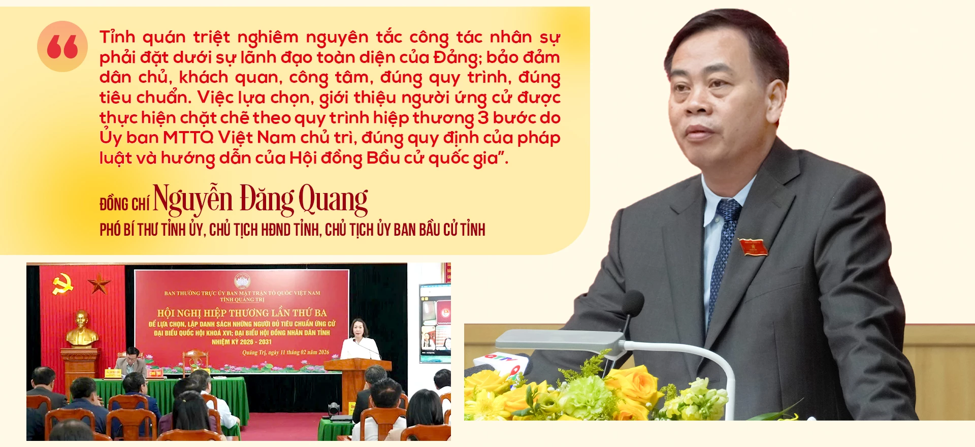 Tỉnh quán triệt nghiêm nguyên tắc công tác nhân sự phải đặt dưới sự lãnh đạo toàn diện của Đảng; bảo đảm dân chủ, khách quan, công tâm, đúng quy trình, đúng tiêu chuẩn. Việc lựa chọn, giới thiệu người ứng cử được thực hiện chặt chẽ theo quy trình hiệp thương 3 bước do Ủy ban MTTQ Việt Nam chủ trì, đúng quy định của pháp luật và hướng dẫn của Hội đồng Bầu cử quốc gia.