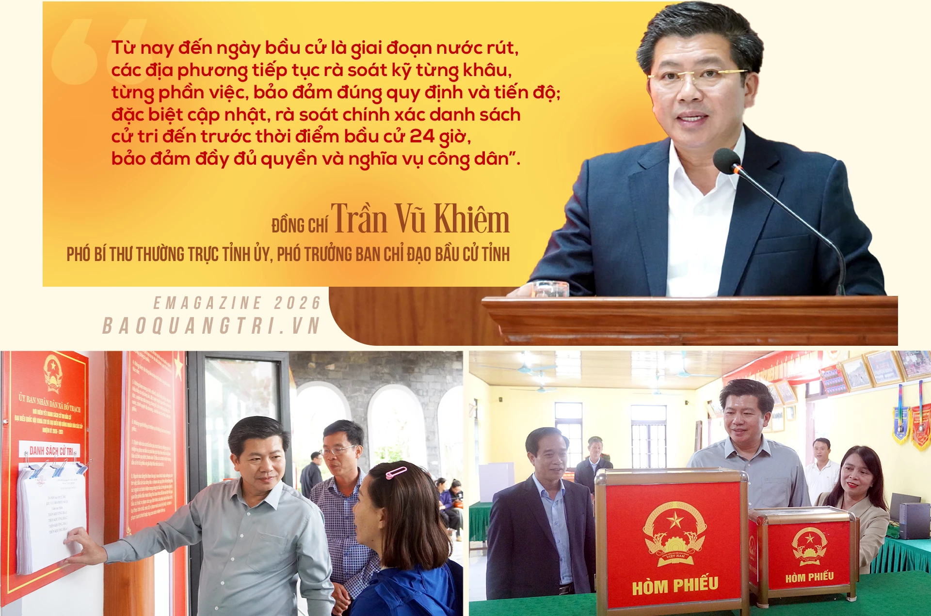 Đồng chí Phó Bí thư Thường trực Tỉnh ủy Trần Vũ Khiêm nhấn mạnh: Từ nay đến ngày bầu cử là giai đoạn nước rút, đề nghị địa phương tiếp tục rà soát kỹ từng khâu, từng phần việc, bảo đảm đúng quy định và tiến độ; đặc biệt cập nhật, rà soát chính xác danh sách cử tri đến trước thời điểm bầu cử 24 giờ, bảo đảm đầy đủ quyền và nghĩa vụ công dân.
