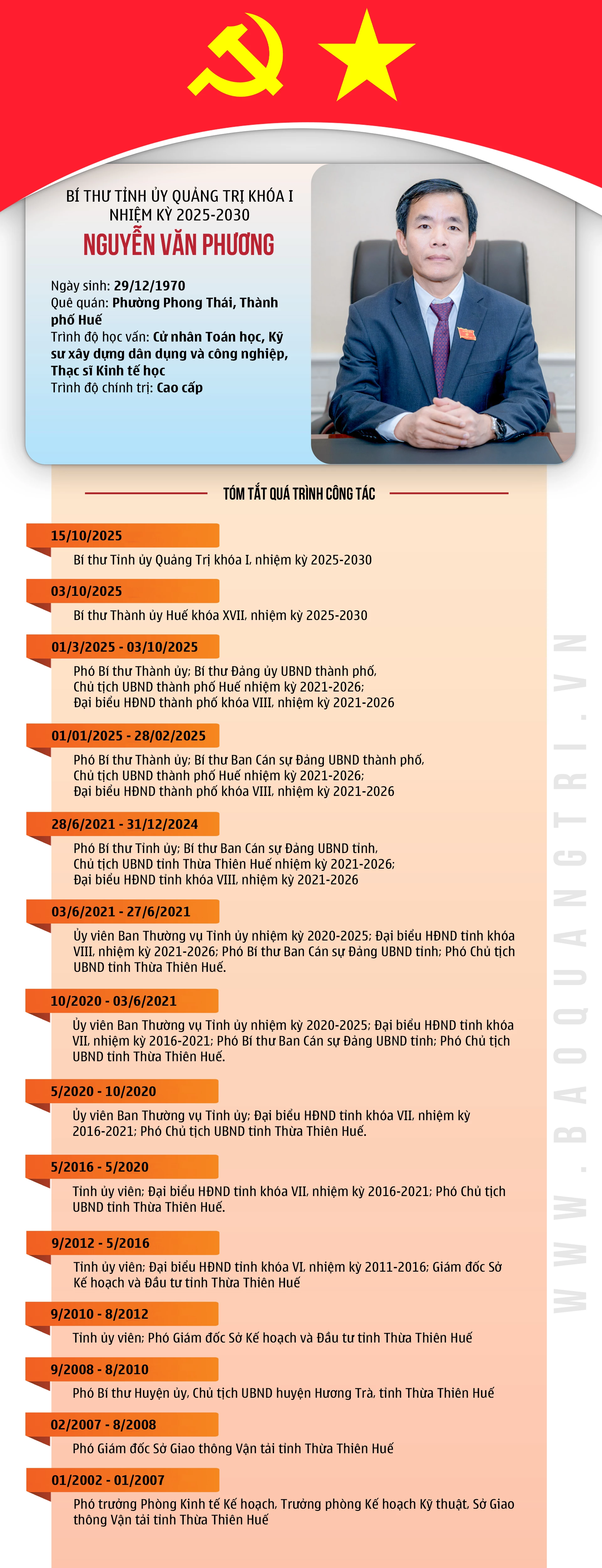 QTO - Ngày 15/10, Bộ Chính trị có quyết định chỉ định đồng chí Nguyễn Văn Phương, Bí thư Thành ủy, Chủ tịch UBND TP. Huế tham gia Ban Chấp hành, Ban Thường vụ và giữ chức Bí thư Tỉnh ủy Quảng Trị, nhiệm kỳ 2025-2030. Báo và phát thanh, truyền hình Quảng Trị trân trọng gửi đến quý độc giả thông tin tiểu sử và tóm tắt quá trình công tác của đồng chí Nguyễn Văn Phương, Bí thư Tỉnh ủy Quảng Trị, nhiệm kỳ 2025-2030.