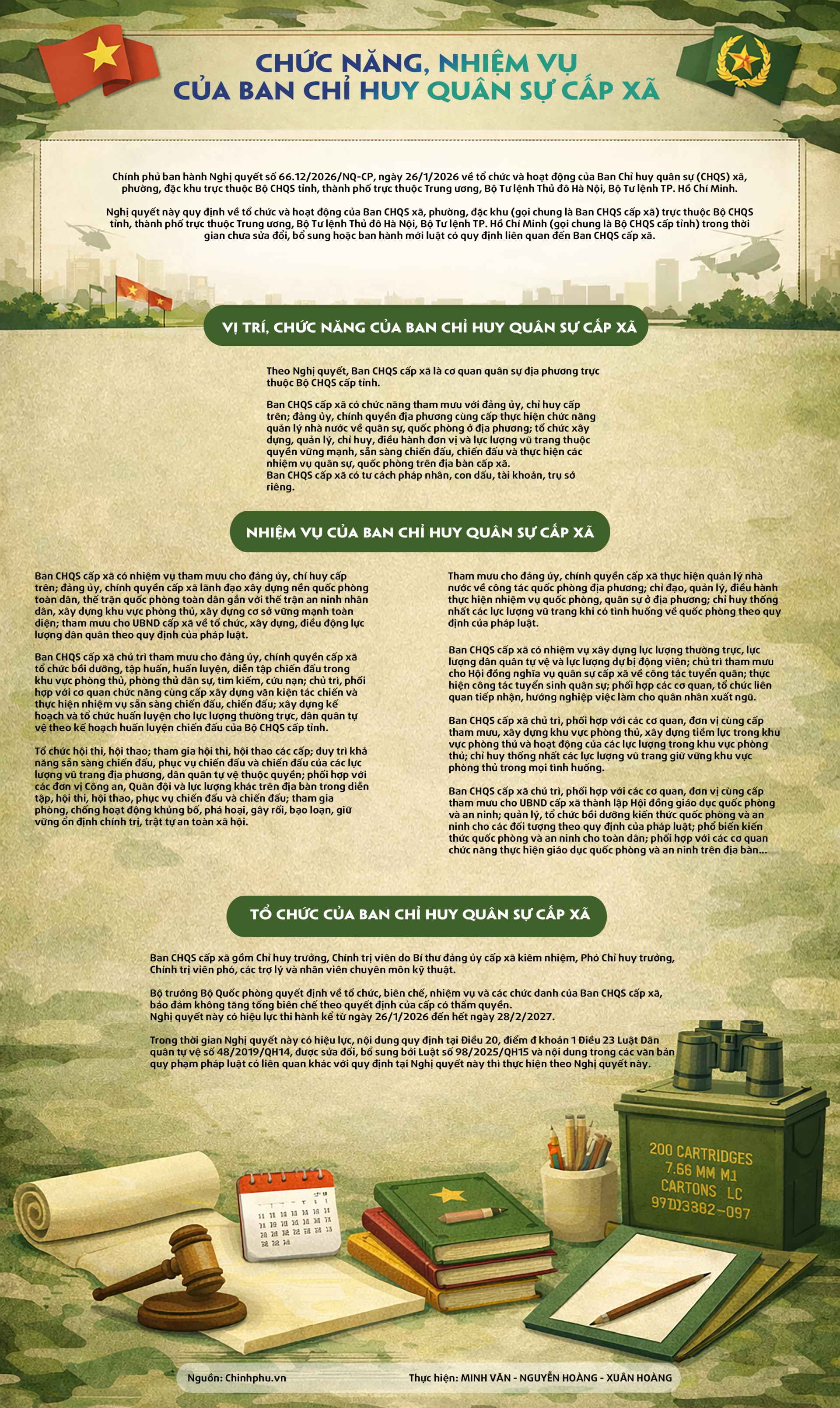 QTO - Chính phủ ban hành Nghị quyết số 66.12/2026/NQ-CP, ngày 26/1/2026 về tổ chức và hoạt động của Ban Chỉ huy quân sự (CHQS) xã, phường, đặc khu trực thuộc Bộ CHQS tỉnh, thành phố trực thuộc Trung ương, Bộ Tư lệnh Thủ đô Hà Nội, Bộ Tư lệnh TP. Hồ Chí Minh.