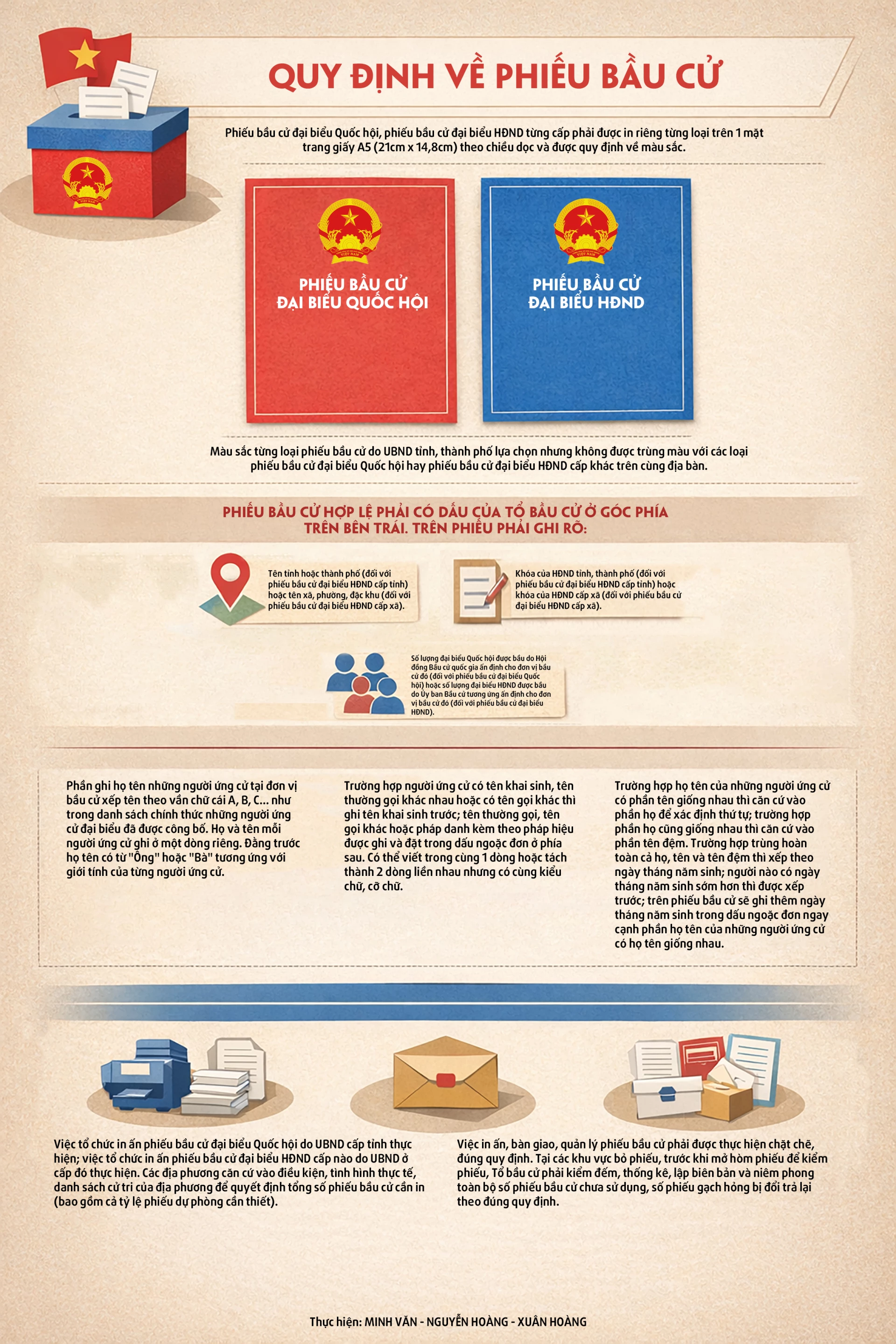 QTO - Phiếu bầu cử đại biểu Quốc hội, phiếu bầu cử đại biểu HĐND từng cấp phải được in riêng từng loại trên 1 mặt trang giấy A5 (21cm x 14,8cm) theo chiều dọc và được quy định về màu sắc.