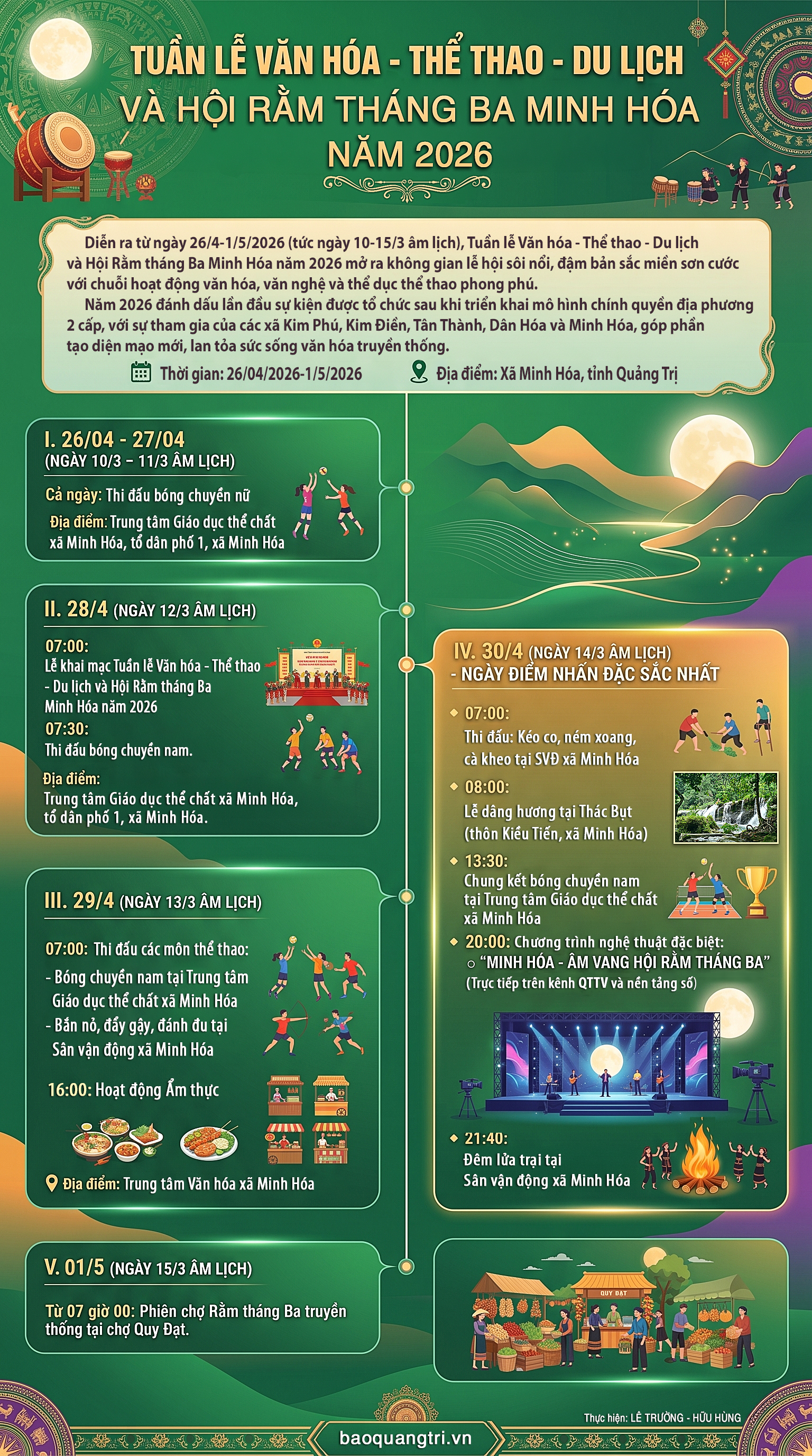 QTO - Diễn ra từ ngày 26/4-1/5/2026 (tức ngày 10-15/3 âm lịch), Tuần lễ Văn hóa-Thể thao-Du lịch và Hội Rằm tháng Ba Minh Hóa năm 2026 mở ra không gian lễ hội sôi nổi, đậm bản sắc miền sơn cước với chuỗi hoạt động văn hóa, văn nghệ và thể dục thể thao phong phú. Năm 2026 đánh dấu lần đầu sự kiện được tổ chức sau khi triển khai mô hình chính quyền địa phương 2 cấp, với sự tham gia của các xã Kim Phú, Kim Điền, Tân Thành, Dân Hóa và Minh Hóa, góp phần tạo diện mạo mới, lan tỏa sức sống văn hóa truyền thống.